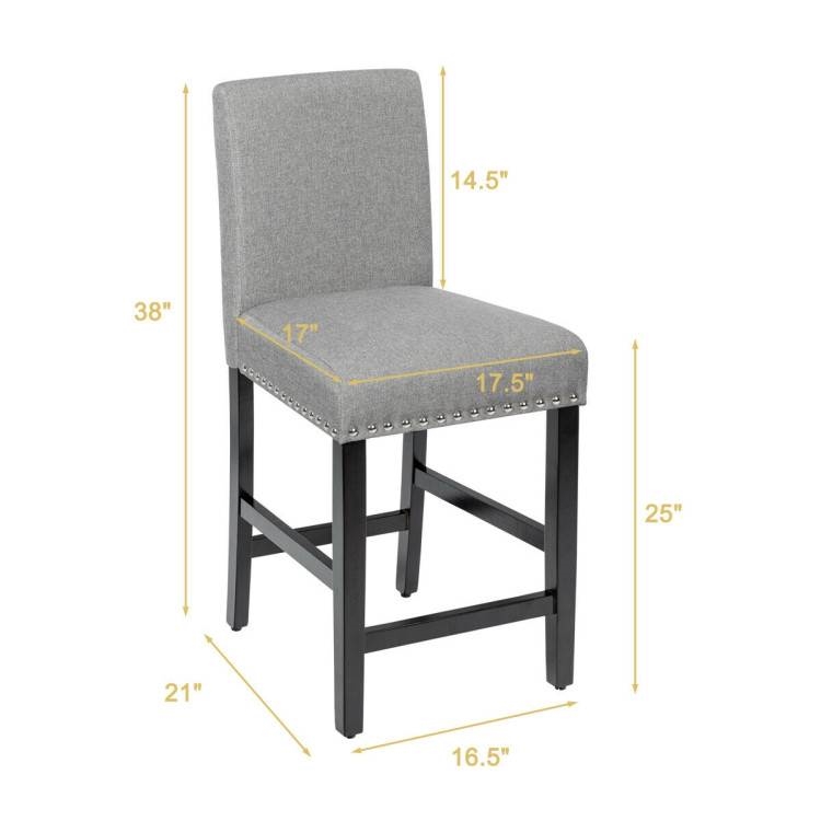 This Set of 2 Modern Kitchen Dining Barstools w/ Black Wood Legs and Grey Linen Seat would be a great addition to your home. The soft cushions of the backrest offer great softness, much more than ordinary bar stools. As well, the interior spring beneath the seat makes for great elasticity and support. The extra breathable linen fabric is amazingly durable and will provide lasting comfort. No matter how tall you are or how long your legs are, these barstool allow you to sit comfortably. The curved backrest is designed to alleviate back strain and provide extra support, while the wide seat is designed to cater to all manner of people – perfect for commercial as well as in-home use. The wood legs feature great sturdiness and enable these barstools to provide firm support. The 4 bars connecting the legs provide a footrest as well as adding to the structural integrity of the stools. Plus, there is no need to worry about any wobbling as the adjustable foot pads provide stability even on uneven floors. The various rivets around the seat add an aesthetic beauty to these bar stools. The stylish appearance makes these a perfect complement to either your dining table or kitchen counter. Use these bar stools to enjoy a drink or as dining chairs to entertain guests. The assembly process is a breeze for anyone thanks to the simple structure and easy-to-understand instructions. Requiring less time and effort, the assembly process is much easier than that of other bar stools. In addition, the solid construction provides great stability and a long life span.