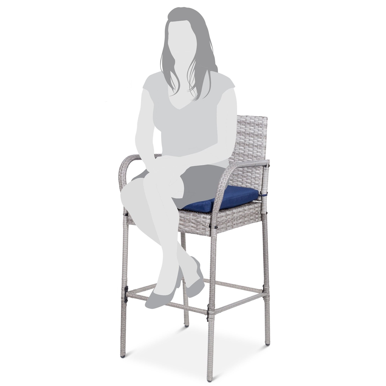 Extra Plush Seat Cushions and extreme comfort make this Set of 2 Grey Indoor/Outdoor Wicker Bar Stools w/ 2 Blue Cushions a prefect addition to any home! 30-inch-high seats make these stools the perfect fit for any standard bar top whether it's in the backyard or the kitchen. Highly durable, weather-resistant wicker covers an iron frame while resisting fading and wear from the sun and rain. Our wide-seated chairs redefine comfort with curved backrests and high armrests that let you lounge without confinement