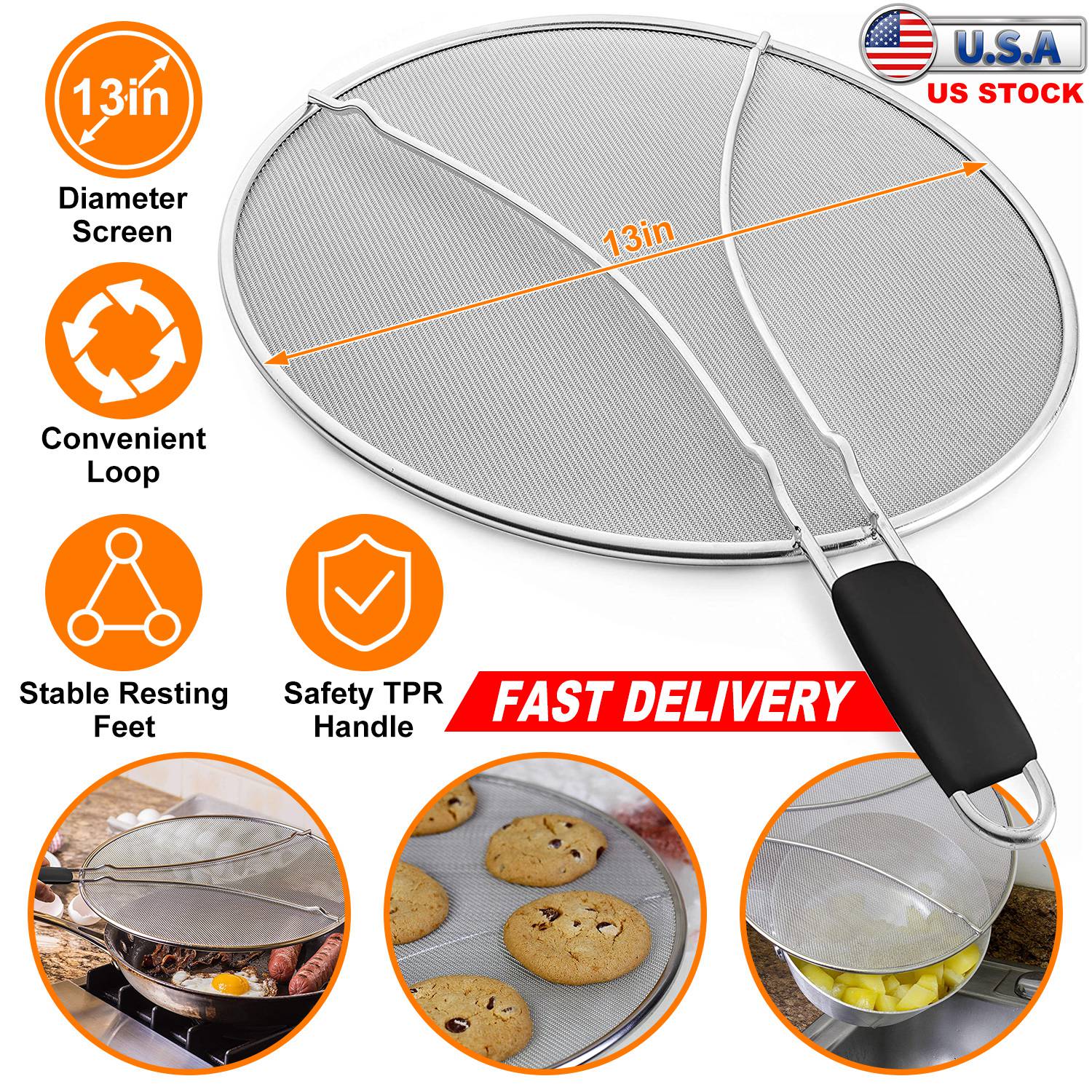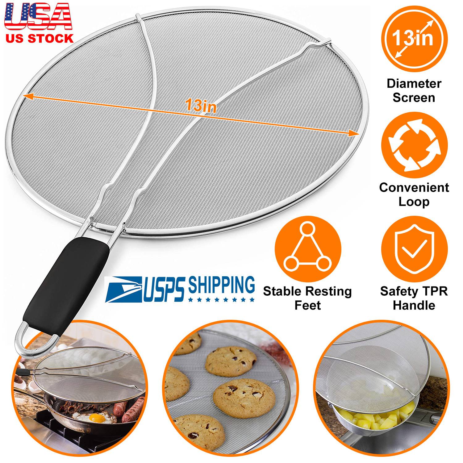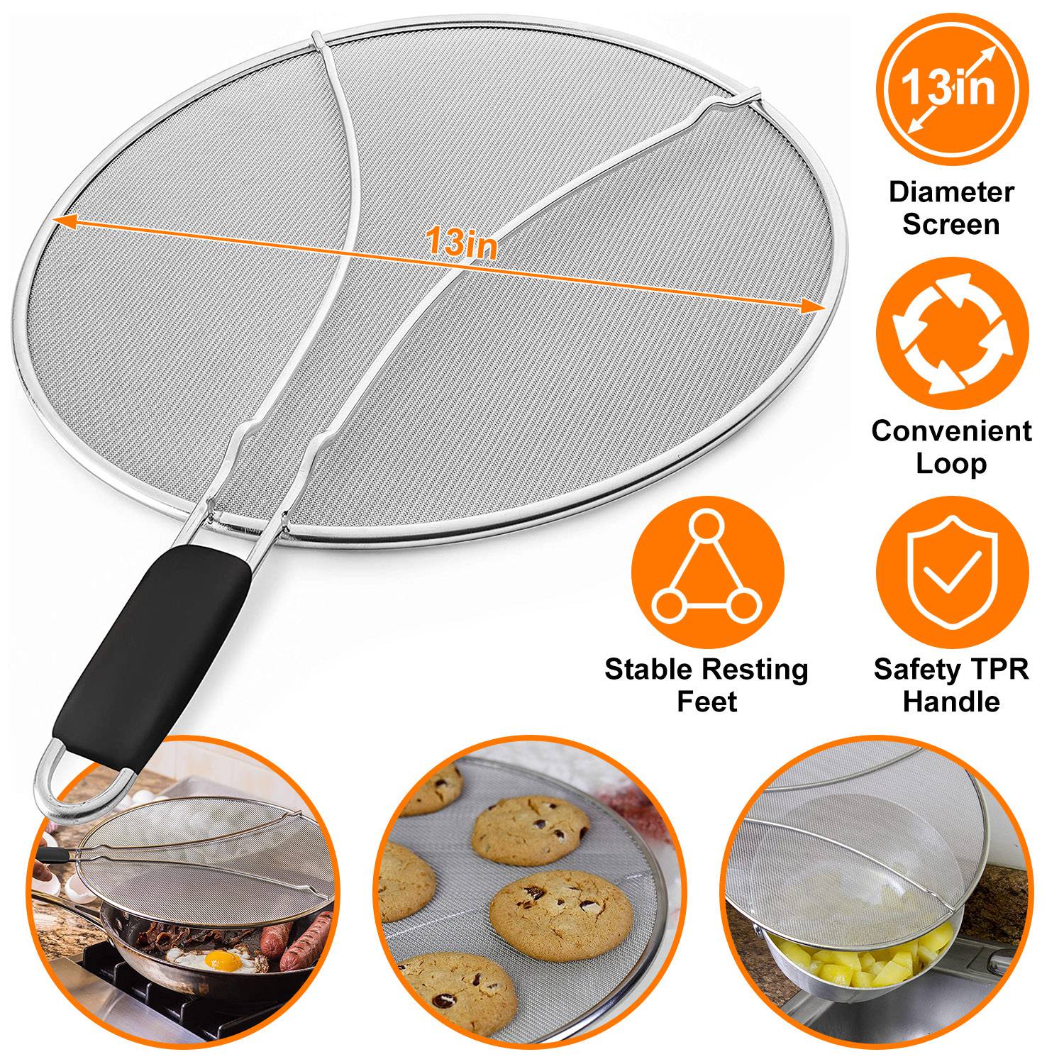Home > Grease Splatter Screen 13in Stainless Steel Fine Mesh Splash Mesh Shield Hot Oil Stopper w/ Resting Feet For Frying Pan Cooking Woks Skillets Pots Pan